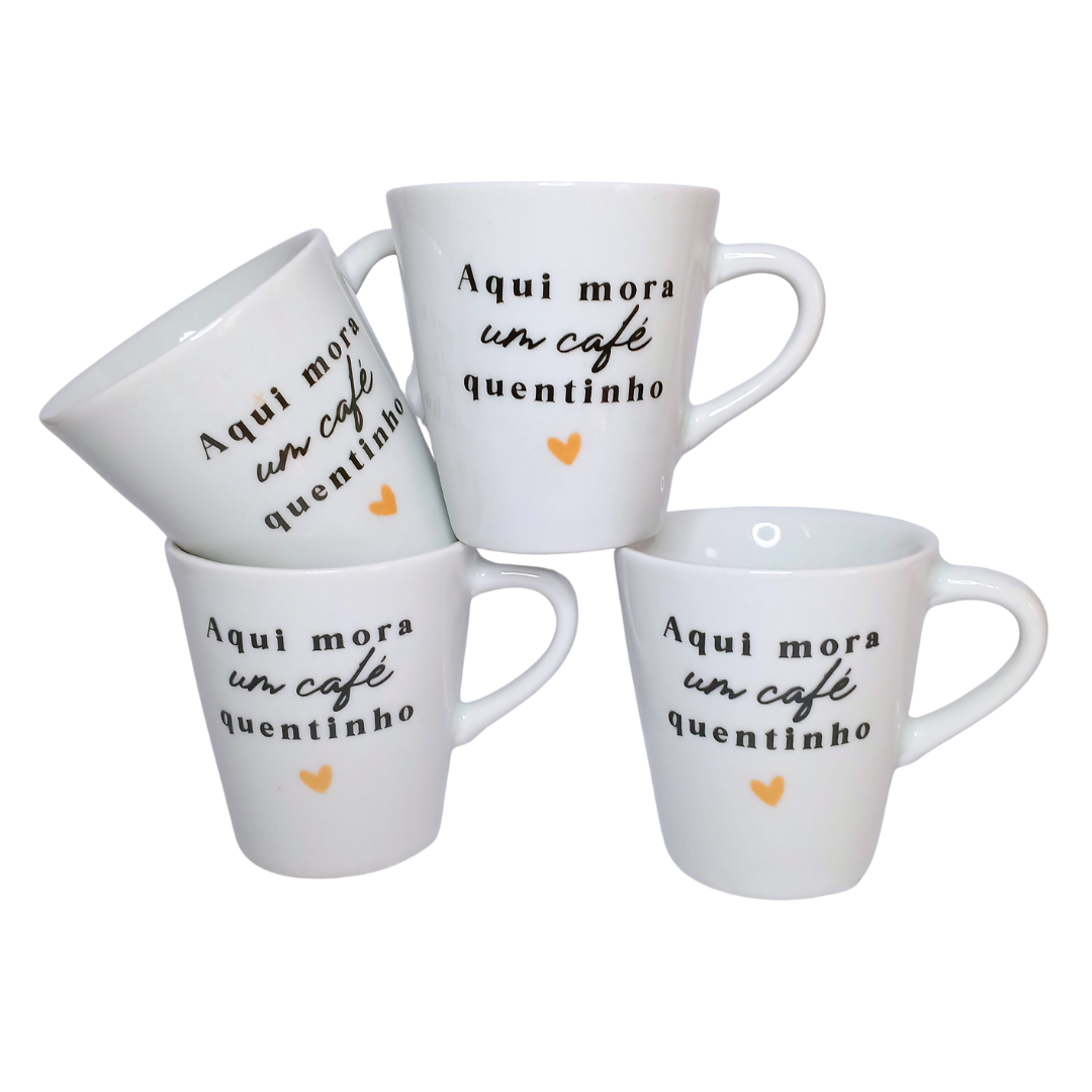 Caneca Porcelana Tulipa 120ml Aqui Mora Café Quentinho Branca